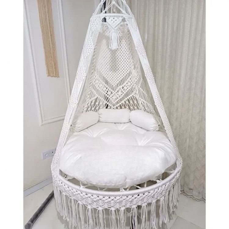 مشتری عزیز تاب ریلکسی دو نفره عربی مکرومه که مشاهده میفرمایید ، مکرومه آن از بهترین نخ والیاف بافته شده است. نخ پلی استر مغزدار شرکت جهان آسا که برخلاف برخی از کارهای بازاری مقاومت بالایی جهت تحمل وزن دارد و تا 180 کیلوگرم را تحمل میکند بدون اینکه به مرور زمان از شکل و ظاهر اولیه خود بیفتد.